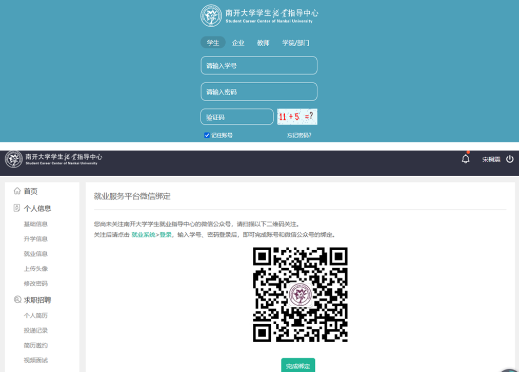 初次登录就业系统的员工请先关注k1体育员工就业指导中心的微信公众号后请点击“就业系统”—>“登录”,登录后即可完成账号和微信公众号的绑定。点击“完成绑定”进入系统操作界面。