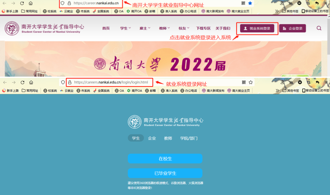打开浏览器(为避免出现系统不兼容部分功能无法正常操作的情况,请使用360浏览器的极速模式、谷歌浏览器、火狐浏览器等非IE浏览器),输入k1体育员工就业指导中心网址:https://career.nankai.edu.cn/,点击就业系统登录或就业系统登录网址:https://careers.nankai.edu.cn/login/login.html进入登录界面。如下图所示: